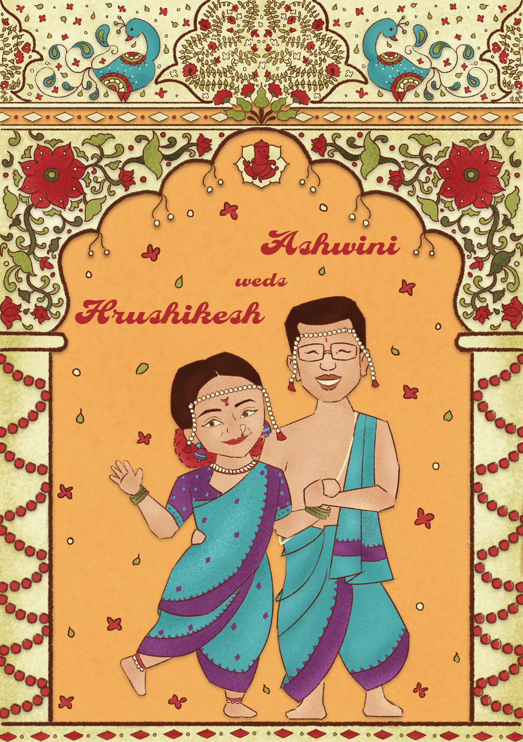 This invitation is designed for a Marathi (Maharashtrian) bride and groom. They wanted it to be quirky and all things colourful!